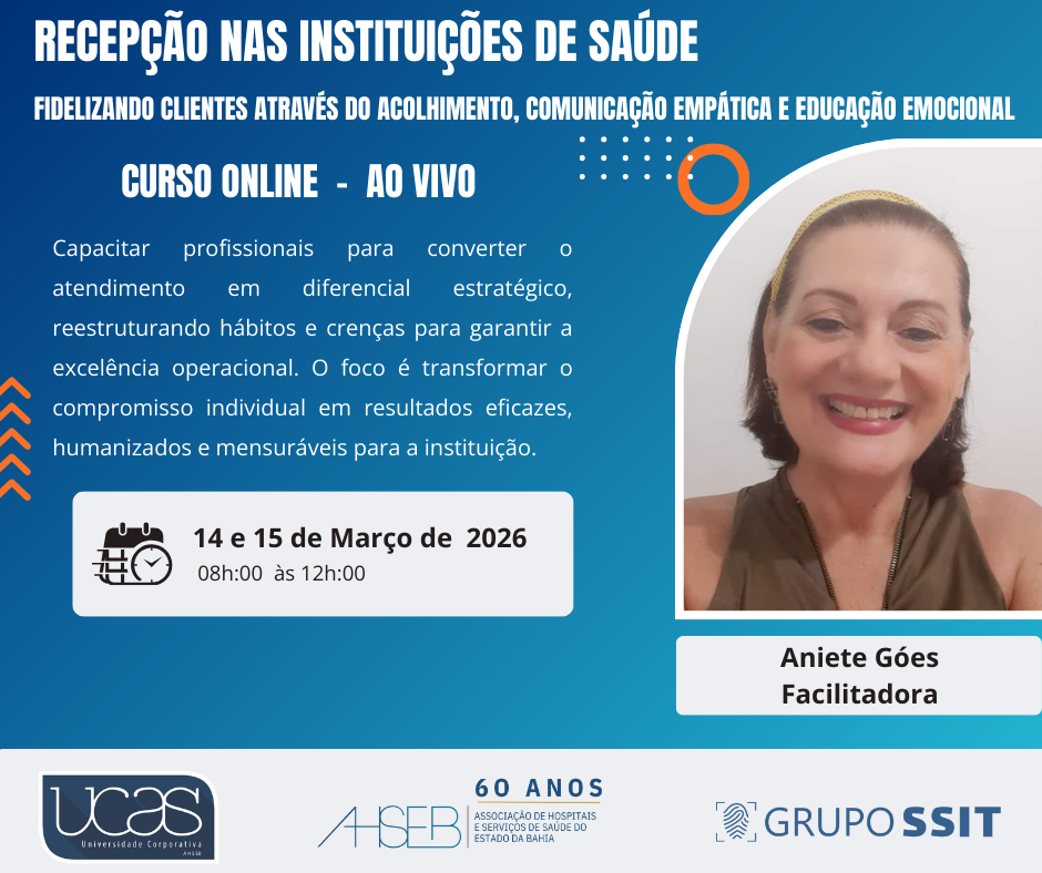 Objetivo: Capacitar profissionais para converter o atendimento em diferencial estratégico, reestruturando hábitos e crenças para garantir a excelência operacional. O foco é transformar o compromisso individual em resultados eficazes, humanizados e mensuráveis para a instituição. Carga horária: 8 horas Horário das aulas: 08:00h às 12:00h Público-alvo: Profissionais que atuam ou queiram atuar em instituições de saúde. […]